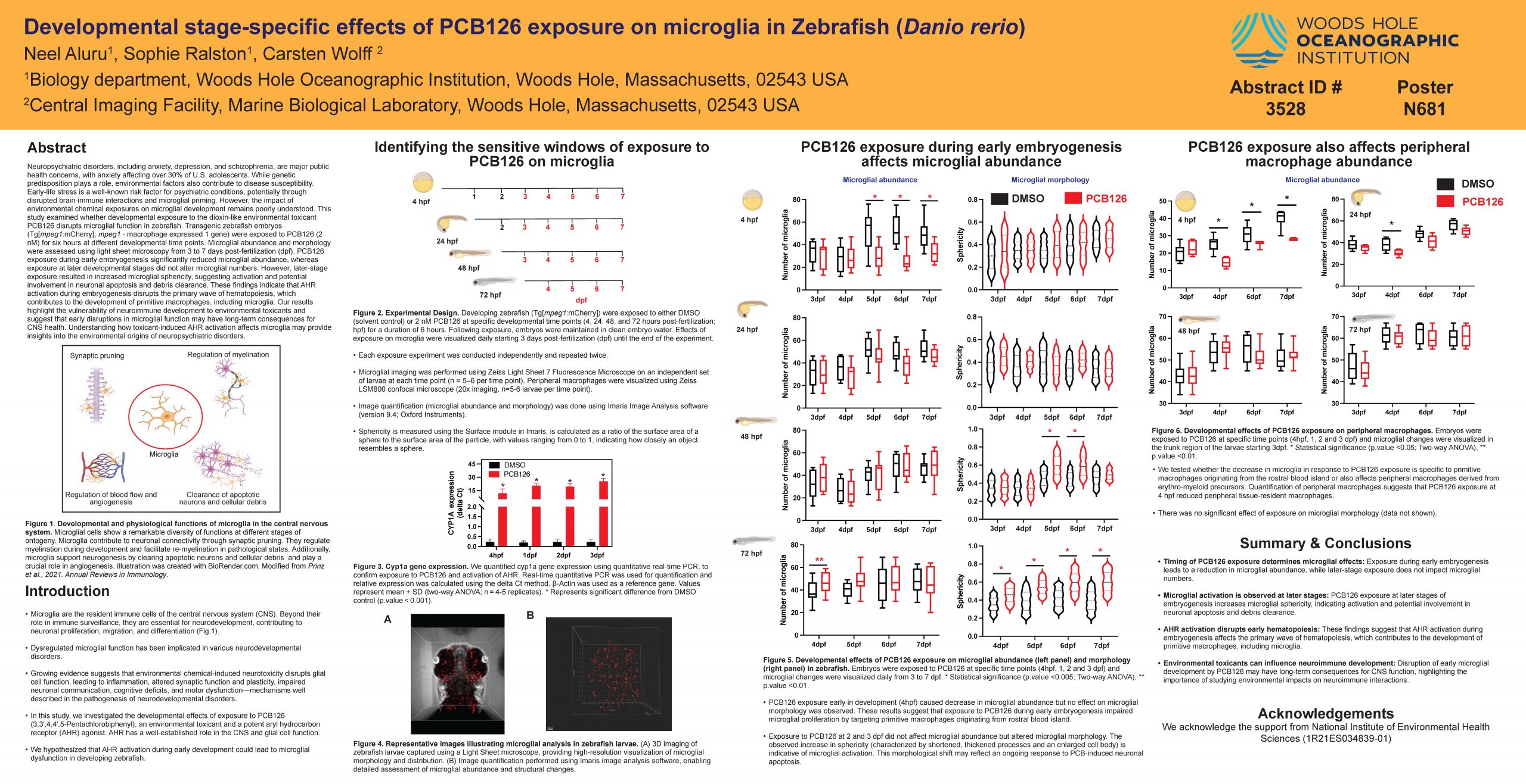 We are also investigating how environmental chemicals such as persistent organic pollutants (PCBs) influence or interact with HAB toxins to modify developmental outcomes. Finally, our aim is to integrate our experimental data with exposure modeling and climate projections to predict how environmental change may alter human exposure risks in the future.